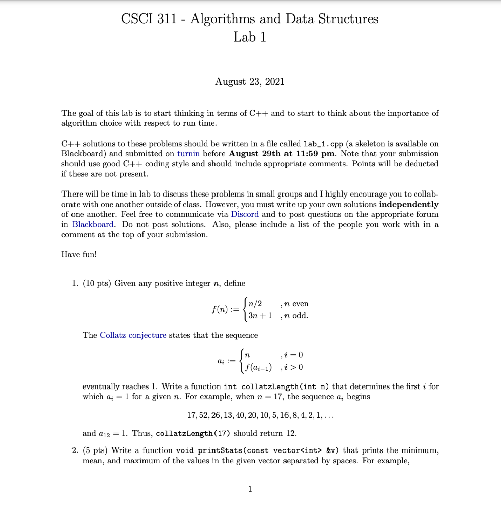 Solved Csci 311 Algorithms And Data Structures Lab 1 Chegg Com